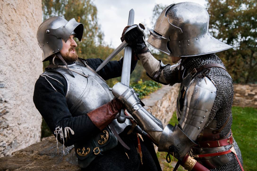 Avoid cutting the weapons with sharp objects, likewise do not hit hard or rough objects, like rocks, benches or trees. Try to avoid substantial blows to edges of armor, especially things like swordbreakers. Also, pay attention to the potential sharp edges of your own gauntlets, as some can cut into cross guards or other parts of the hilt when fencing. Make sure to avoid long term compression of the eapons, especially during storage. Our cross guards are made of hard rubber and do not mind blows in combat, they bend slightly but return immediately. The cross guards however can get deformed with extreme bending over longer periods, when they are for example put under luggage in the trunk of a car or in a chest.