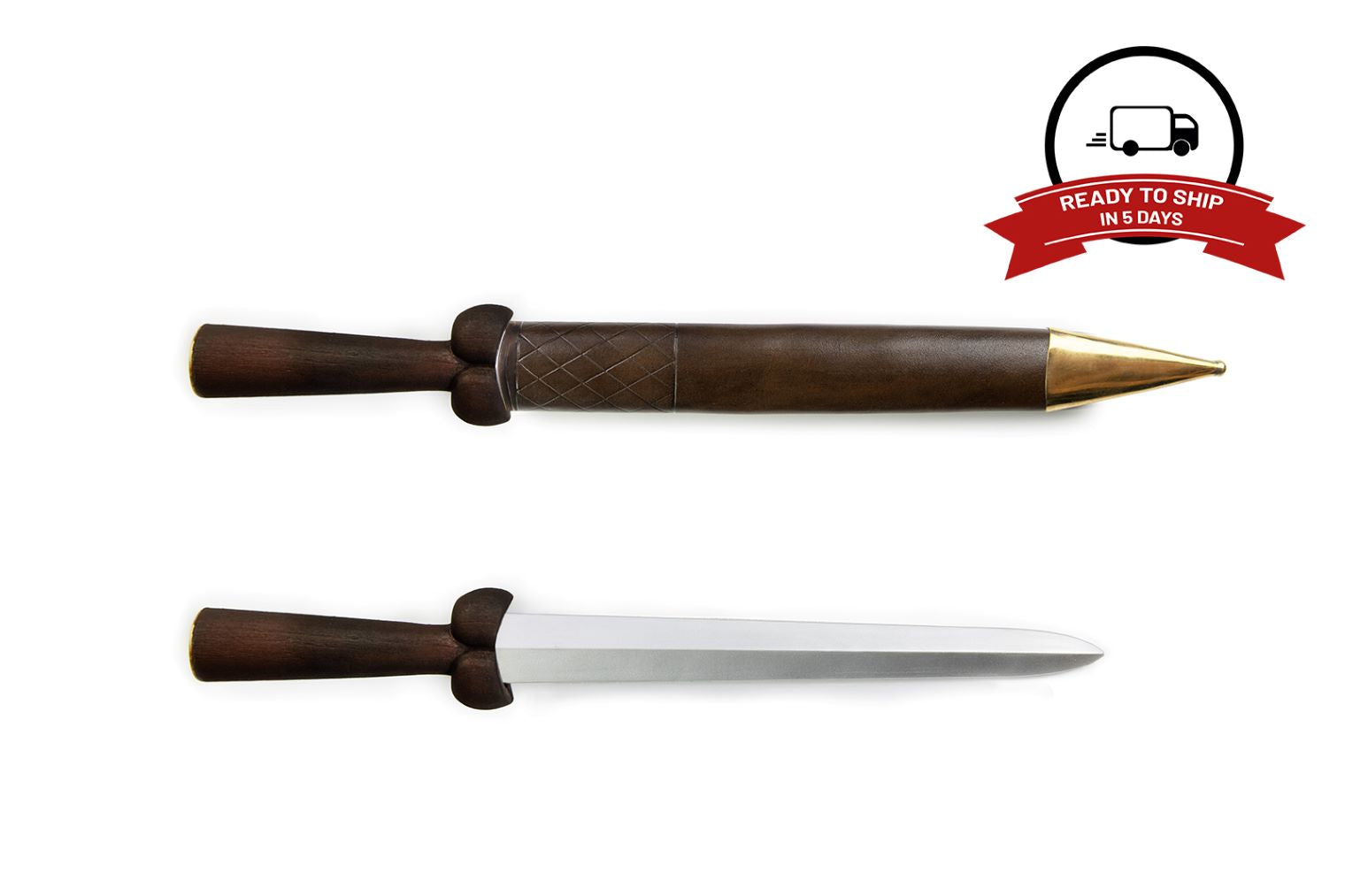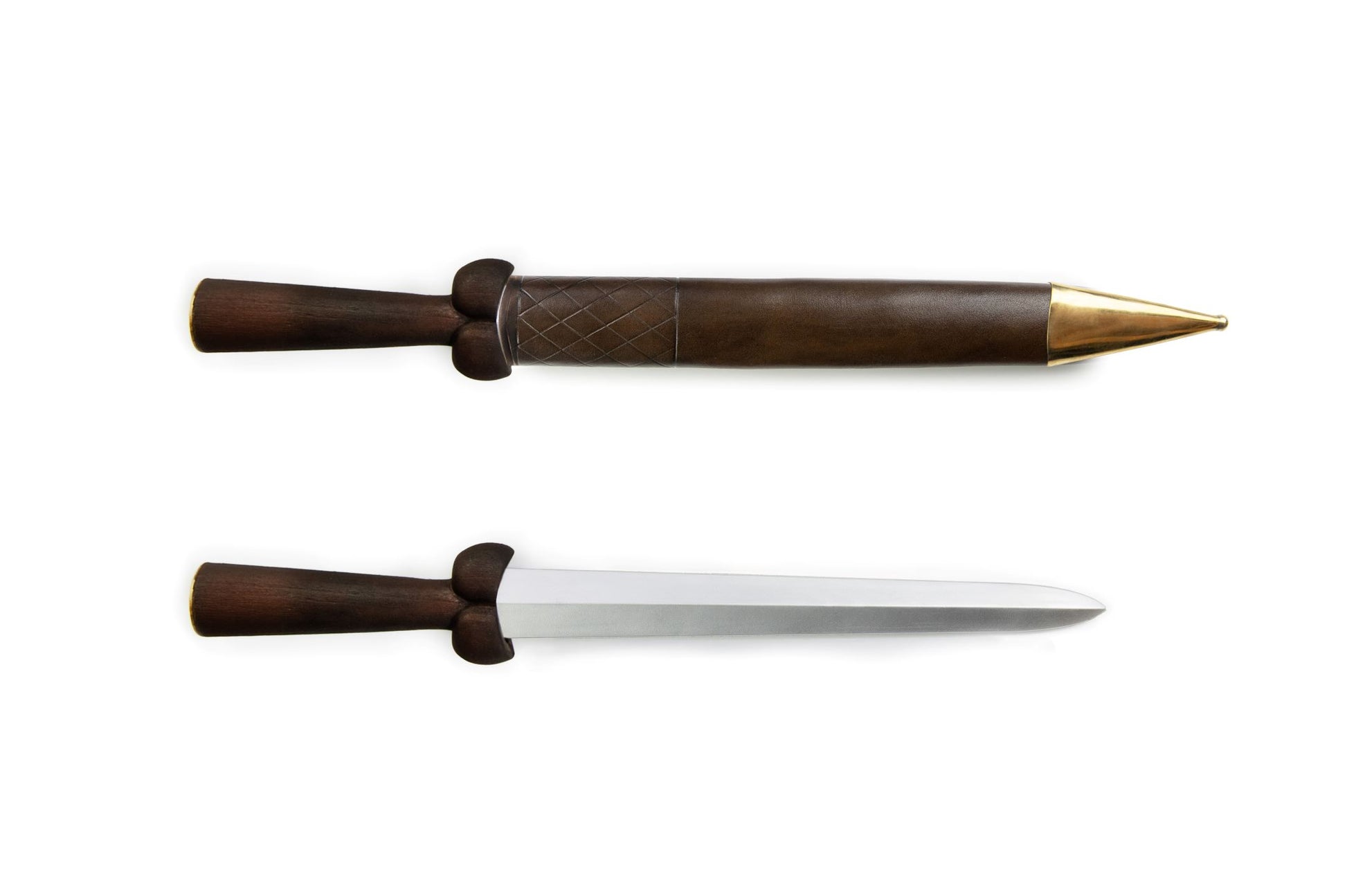 The name bollock dagger is derived from the phallic shape of the hilt and the 14th century warrior's propensity for wearing the dagger directly in front of the girdle. First appearing on continental effigies around 1300-1350, the bollock dagger has one of the longest usage life spans of the five main types of Medieval daggers.