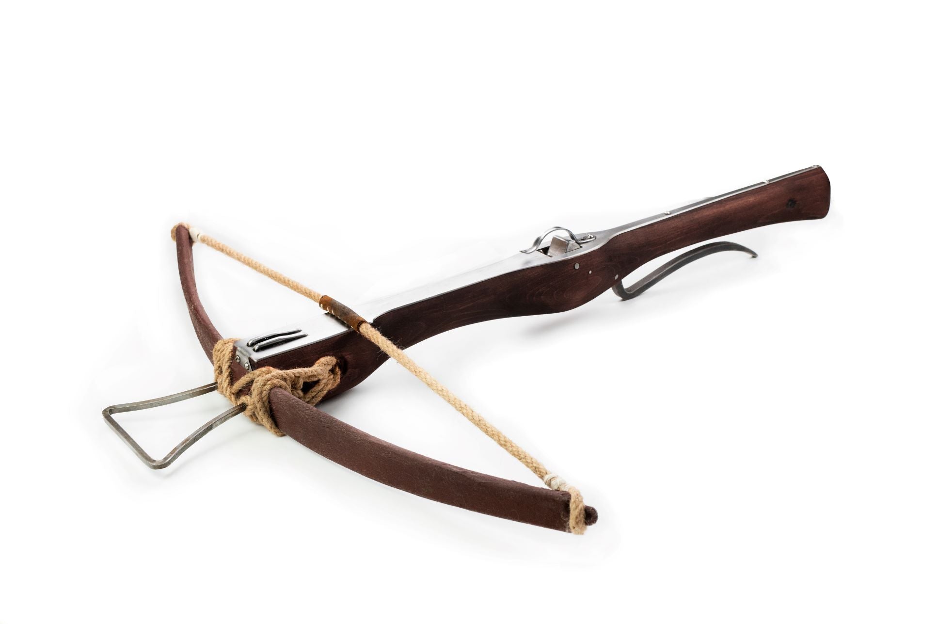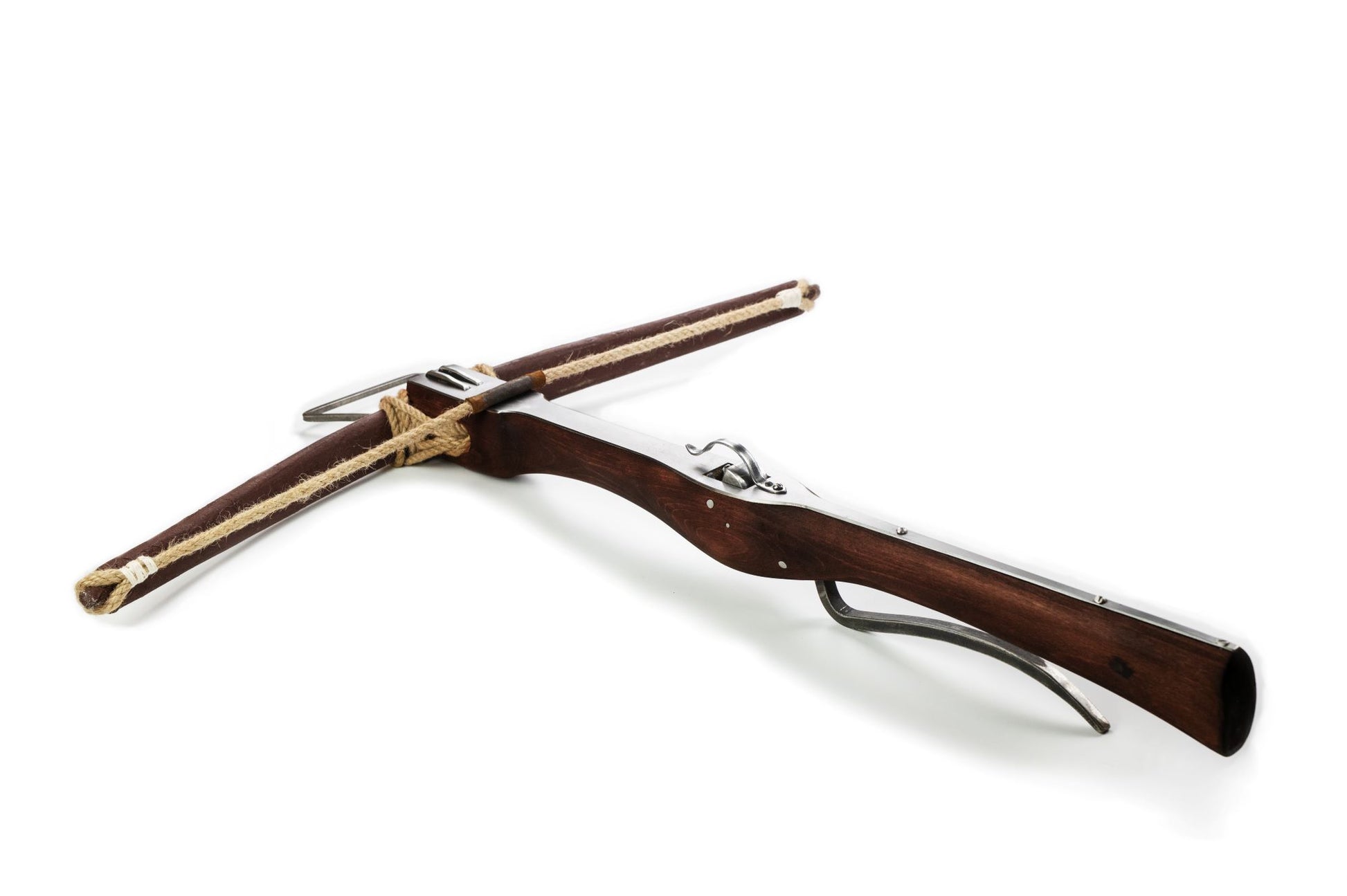 The body of the crossbow is made out of sturdy beechwood and treated with wood stain and linseed oil. The string and the rope securing the bow are made out of hemp. The rail on top of the body is made out of stainless steel, while the rest of the steel components are made out of regular steel. The nut mechanism  is made to automatically lock into position when drawing the string.