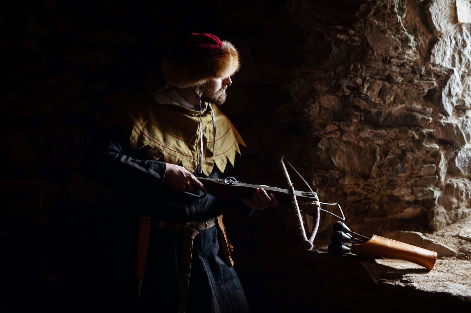 To prevent unnecessary strain on the bow of the crossbow, it should be unstrung every time it is put to storage and strung again for use. It’s not necessary to unstring it in the evening of an event, but you should definitely do so at the end of it. The stringing is very easy thanks to the relatively low strength of the bow and the simplest technique is shown in our Crossbow video.