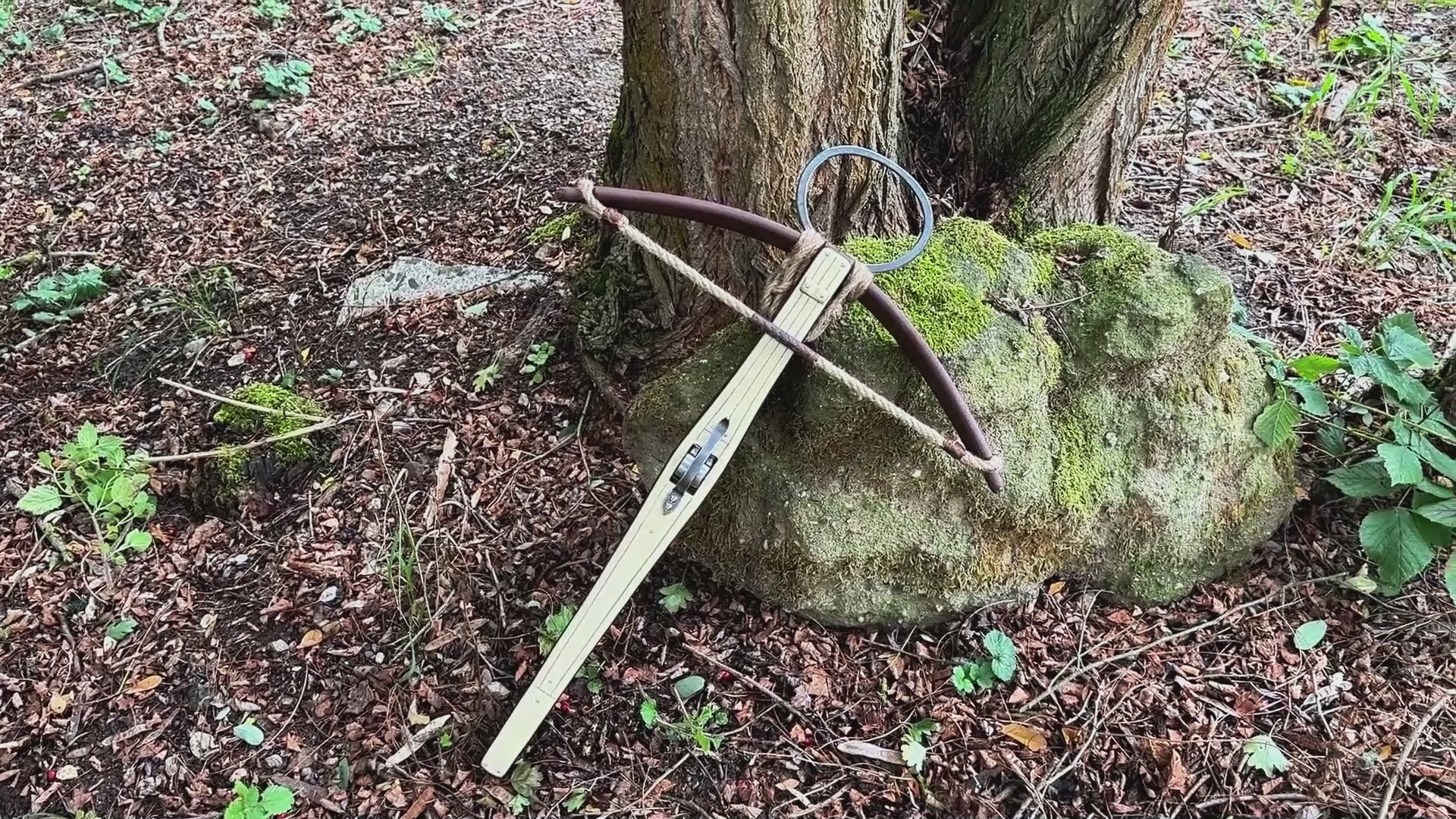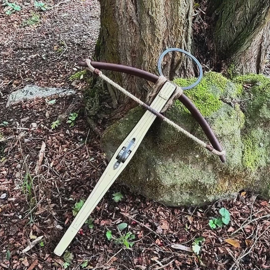 The body of the crossbow is made out of sturdy beech or maple wood and treated with wood stain and oil. You can choose between four woodstain hues and three styles of stirrups. The string and the rope securing the bow are made out of hemp. The rail on top of the body is made out of PVC-U, which simulates bone inlay, which was very popular with this style of crossbow. The steel components are made out of regular mild steel. The nut mechanism is made to automatically lock into position when drawing the string.