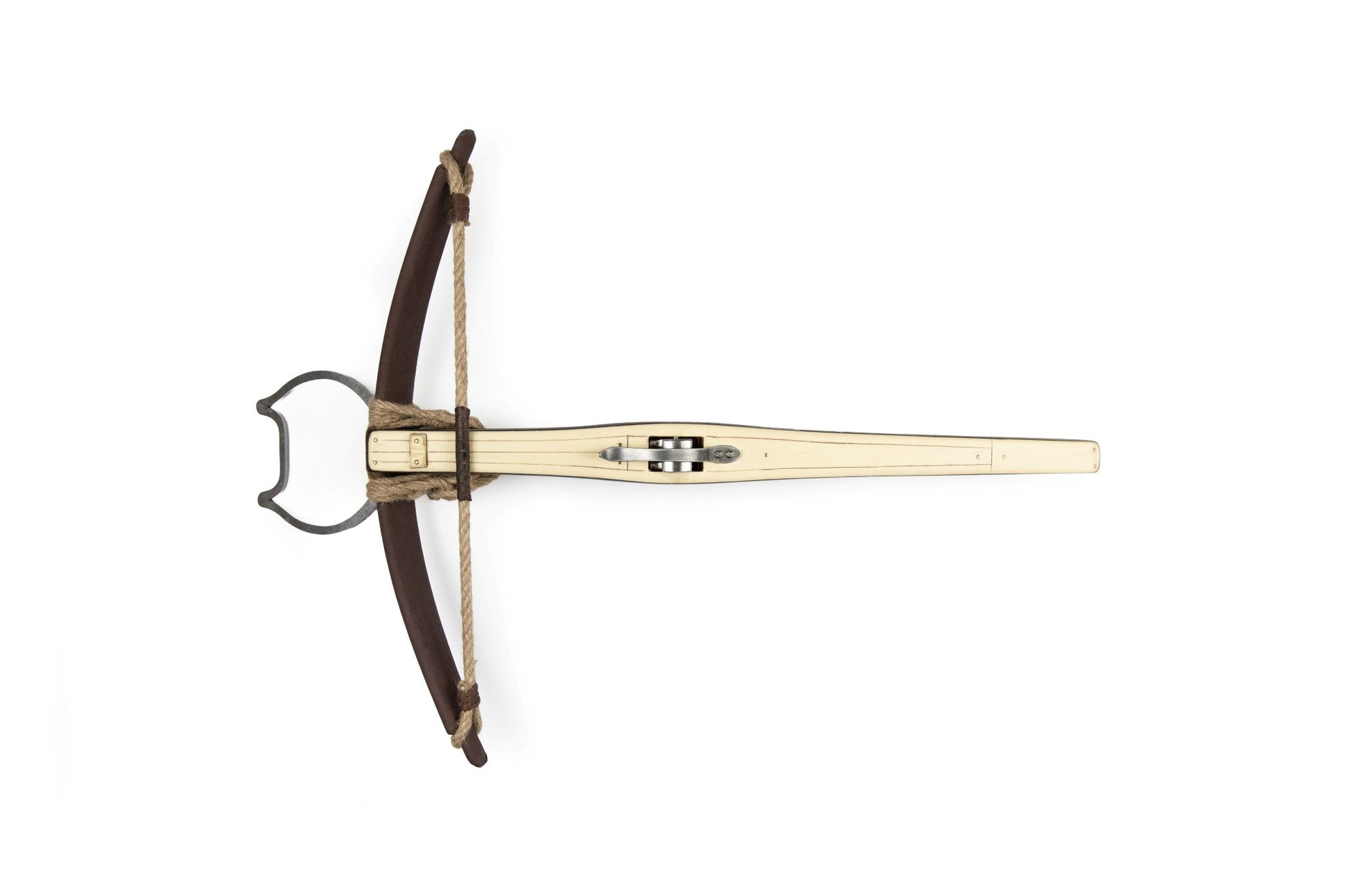 The body of the crossbow is made out of sturdy beech or maple wood and treated with wood stain and oil. You can choose between four woodstain hues and three styles of stirrups. The string and the rope securing the bow are made out of hemp.