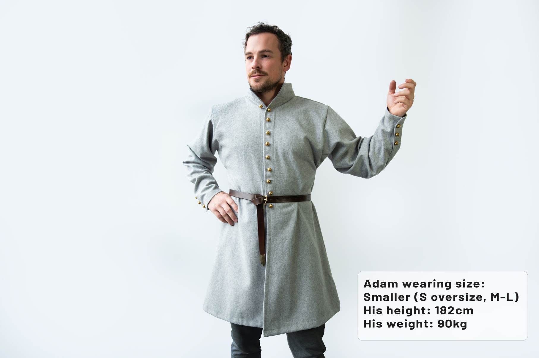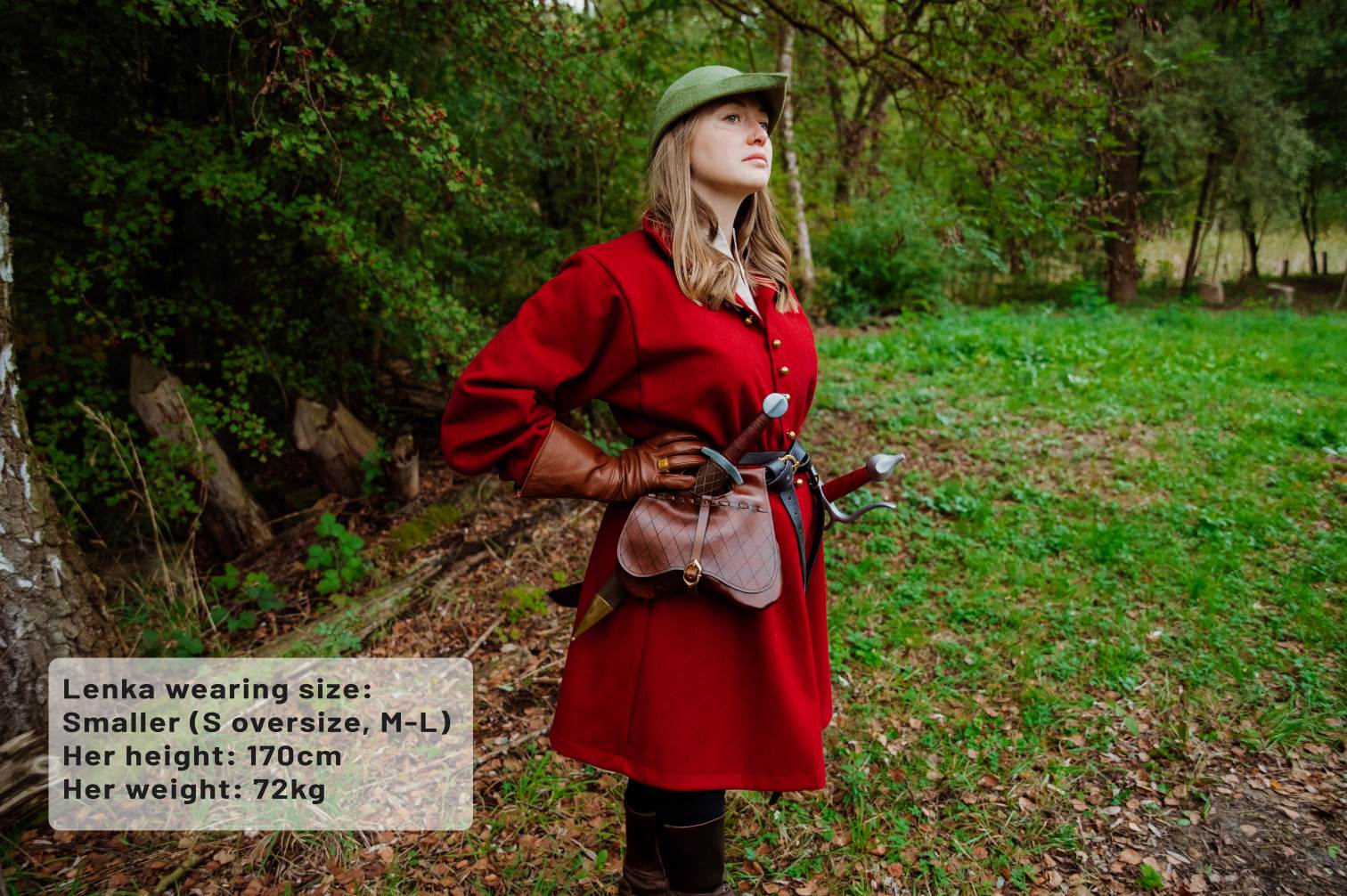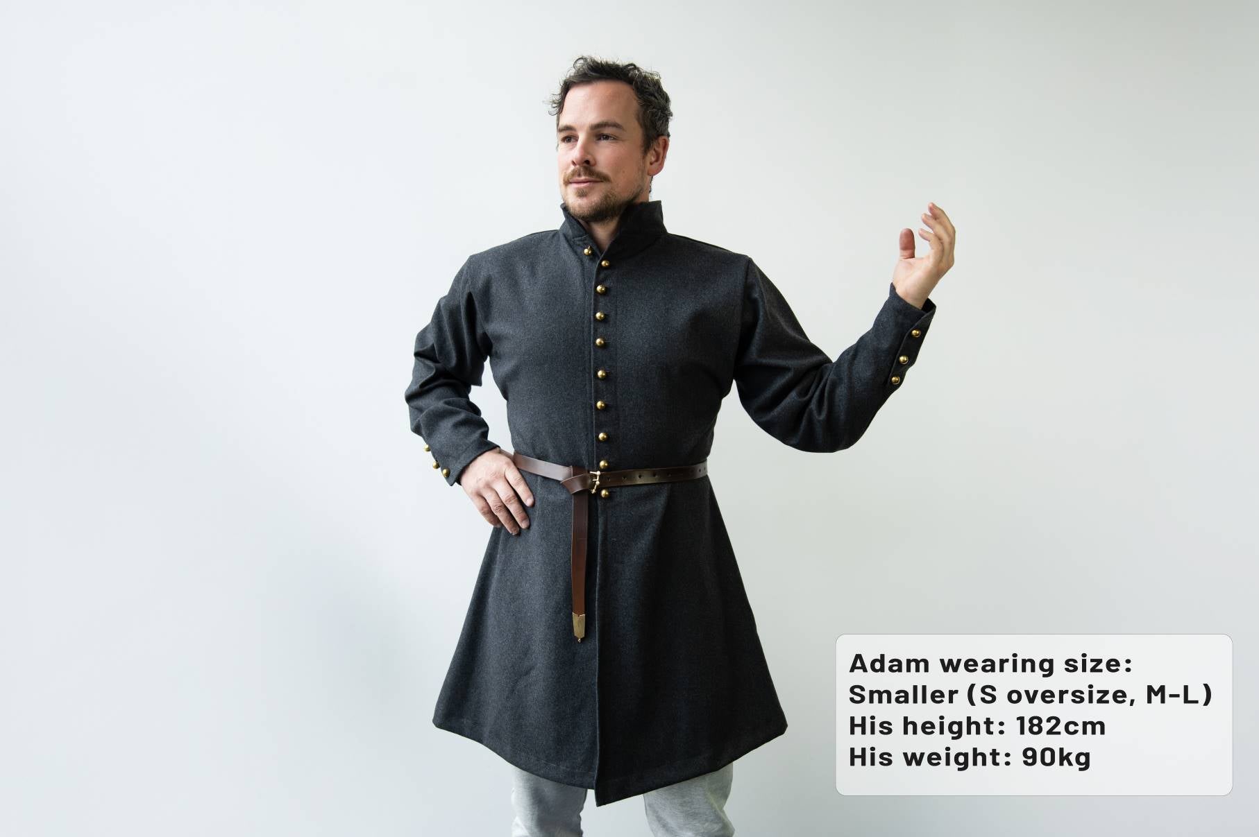 The material we use is woolen Melton, which is a very densely woven and semi-felted mix of 60% wool and 40% viscose. Both of those are fibres with excellent breathability and thermoregulation properties. The viscose in the mix makes the fabric stronger and nicer to the touch, even for people who find regular wool scratchy. The fabric is relatively thin, but because it is melton, it’s very resistant to wear and doesn’t suffer from pilling (little balls of fibre forming on the surface). The thickness we chose is tailored for the usual larping season. It’s light enough to be comfortable even in the worst summer heat, but it will keep you cozy in slightly chilly Spring or Fall events. It is not suitable as your main coat for colder environments.