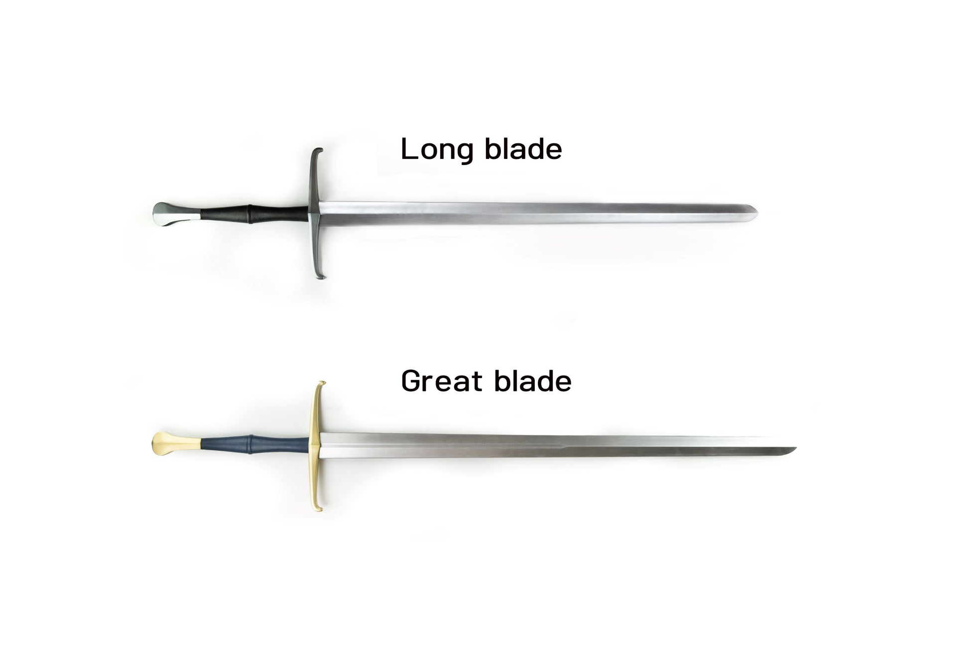 The sword is commonly held in combat with both hands (although some may be used single-handed). Our Longsword is 124cm long with 34cm long hilt and 90cm Great blade. The sword weighs 1150 g. It can only be ordered only with a 16x8 core and a deluxe leather wrap with ring.
