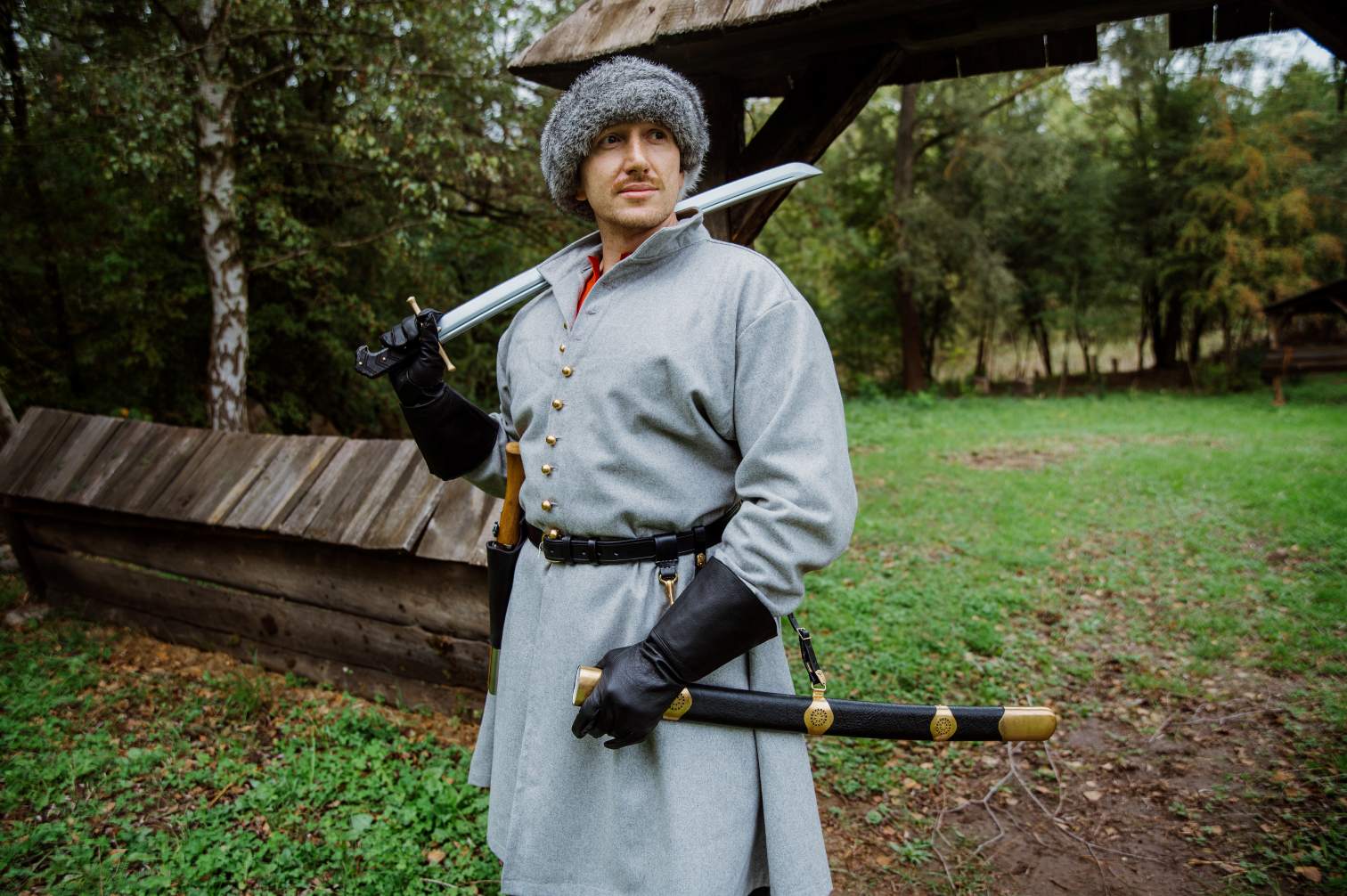 The shape of the mouth and the shape of the scabbard are always adjusted to fit the sabre ordered with it, as well as its overall length. The scabbard attaches to the belt with adjustable leather straps with loops that are connected to the scabbard with brass or steel fittings. The loops on the straps can fit any belt, up to a maximum width of 3cm.