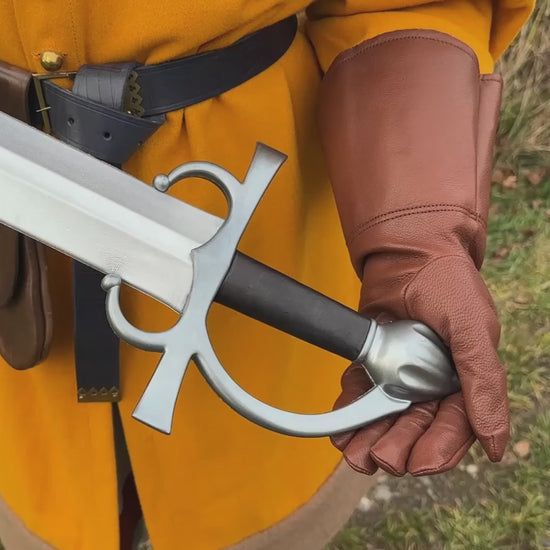 The sidesword is a transitional weapon between the arming sword of the Middle Ages and the rapier of the Renaissance. It is, in essence, a cut-and-thrust arming sword with the addition of a complex hilt that protects the user’s hand. Our LARP foam sword features a crossguard, finger rings and knuckle bow.