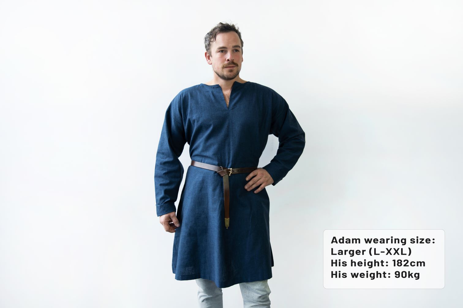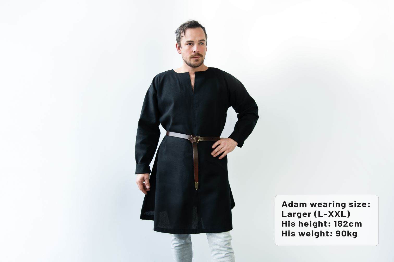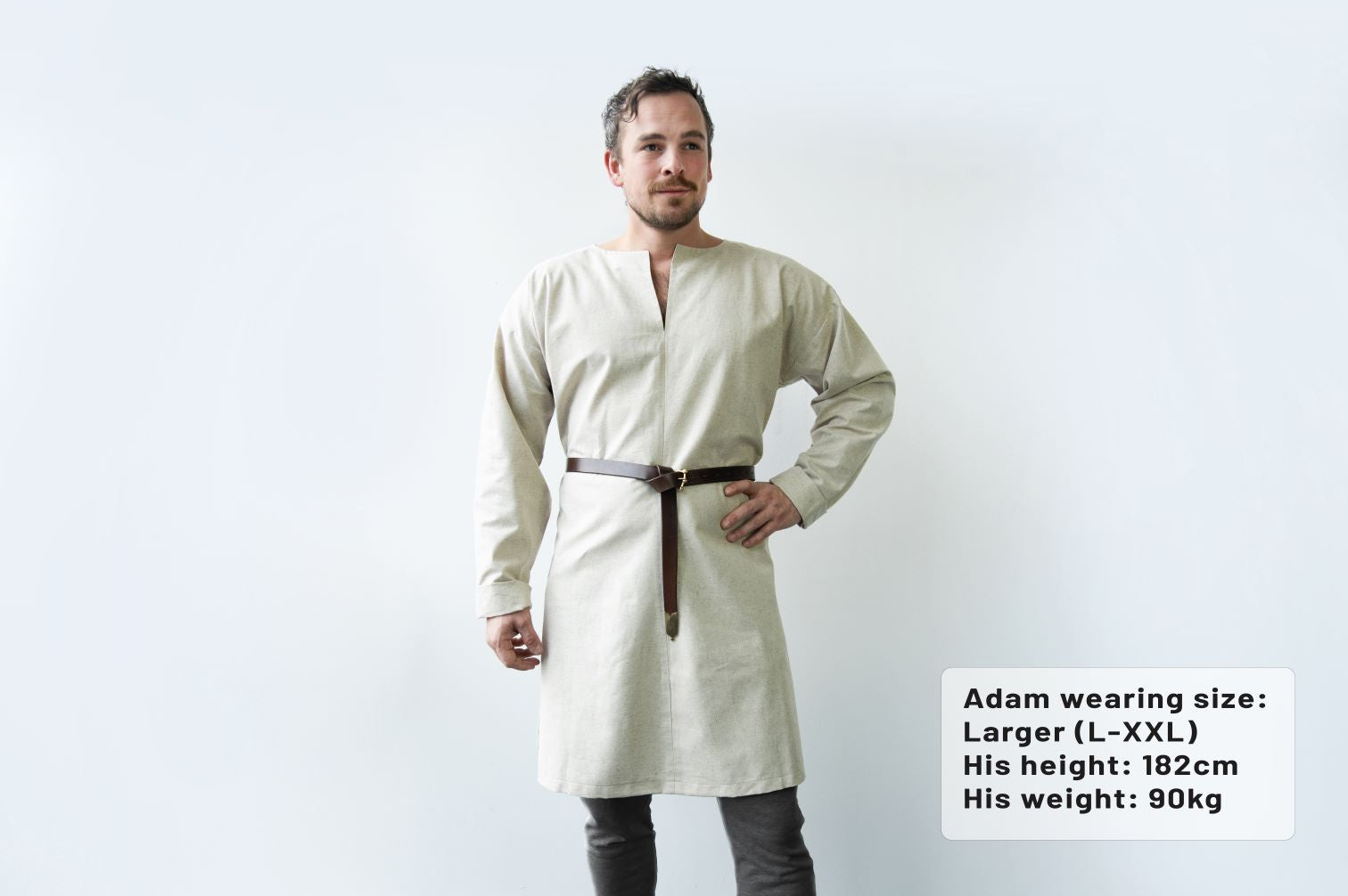 Our linen-cotton blend tunic is inspired by one of the most prolific designs throughout history, from Antiquity to the Early Modern Period. It can be used as the top layer of a lighter costume, or an underlayer for our coats. While they’re typically referred to as shirts rather than tunics, the undergarments of the medieval and renaissance periods are very similar to this product. It can work for almost any fantasy costume style you’d like to build.