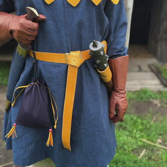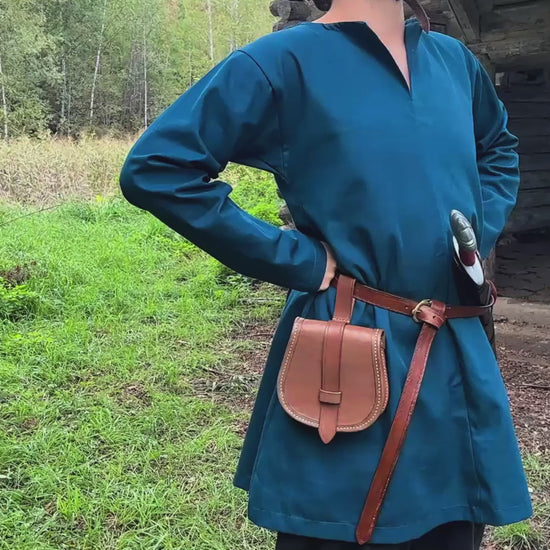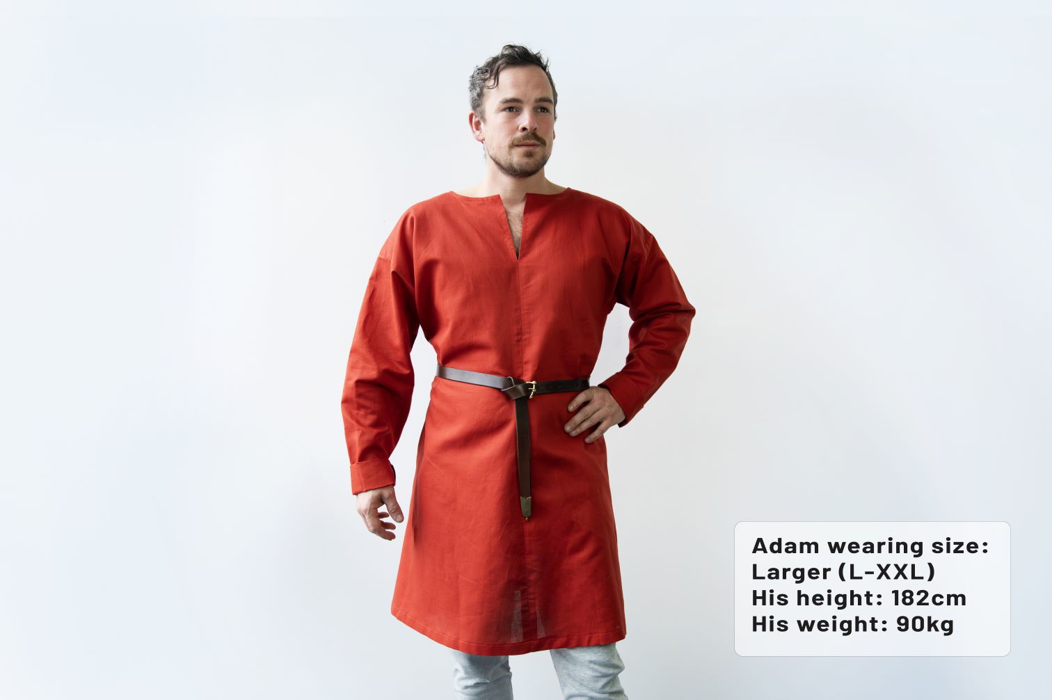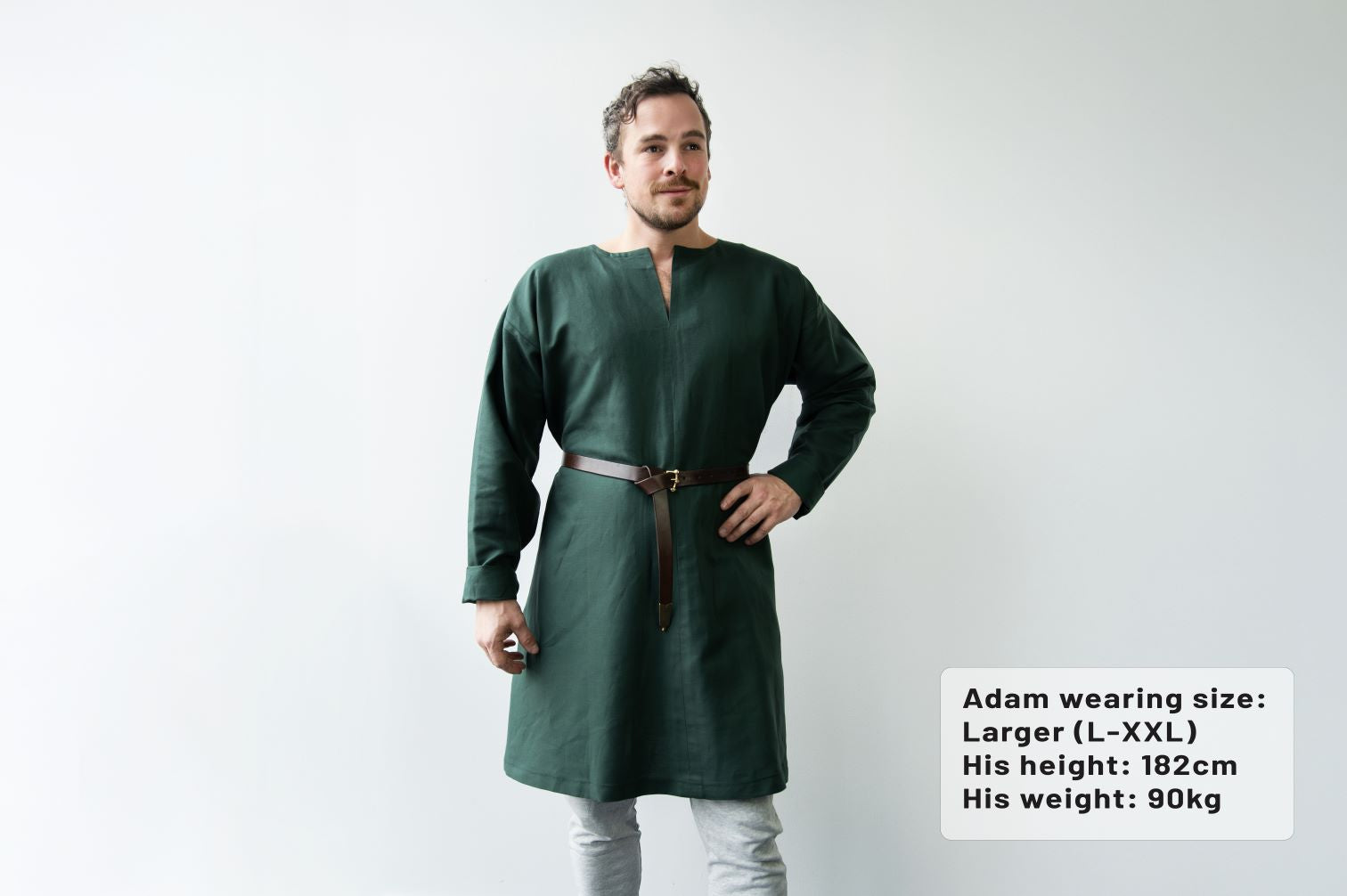 Our linen-cotton blend tunic is inspired by one of the most prolific designs throughout history, from Antiquity to the Early Modern Period. It can be used as the top layer of a lighter costume, or an underlayer for our coats. While they’re typically referred to as shirts rather than tunics, the undergarments of the medieval and renaissance periods are very similar to this product. It can work for almost any fantasy costume style you’d like to build.